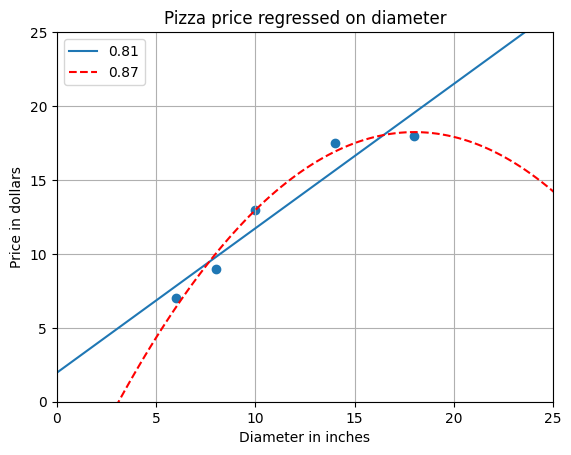 确实较好,但是很明显图中是不合逻辑的,如果披萨的尺寸变大,那么价格反而下跌,这个模型只是在训练数据上表现的性能还不错。