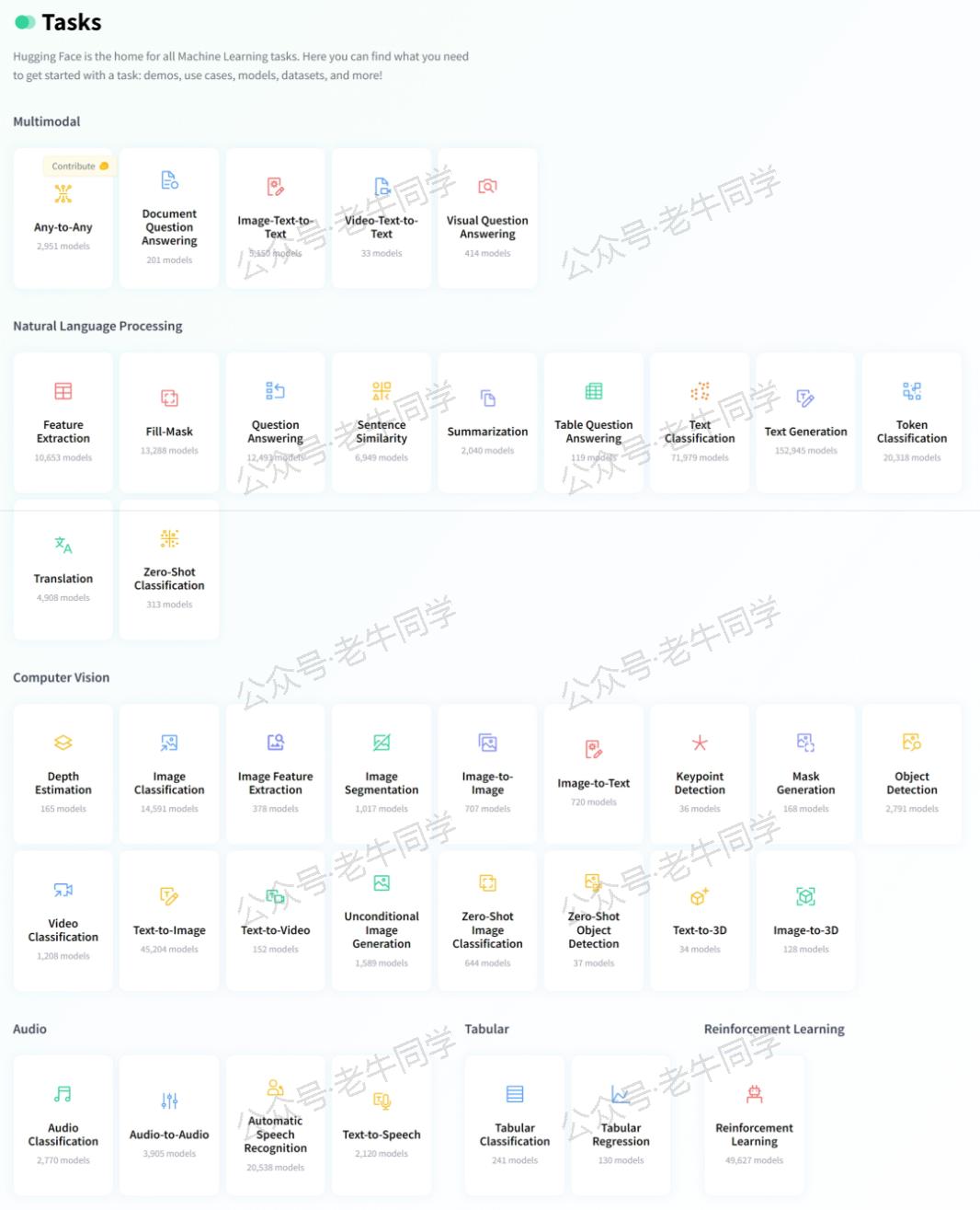 在 Hugging Face 官网上,这些任务被归为六大类:多模态(Multimodal)、自然语言处理(Natural Language Processing,NLP)、计算机视觉(Computer Vision)、音频(Audio)、表格(Tabular)和强化学习(Reinforcement Learning)。