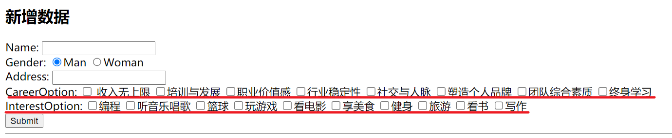 在项目开发中,如何保存多选项的值呢?例如下图中的职业发展和兴趣爱好