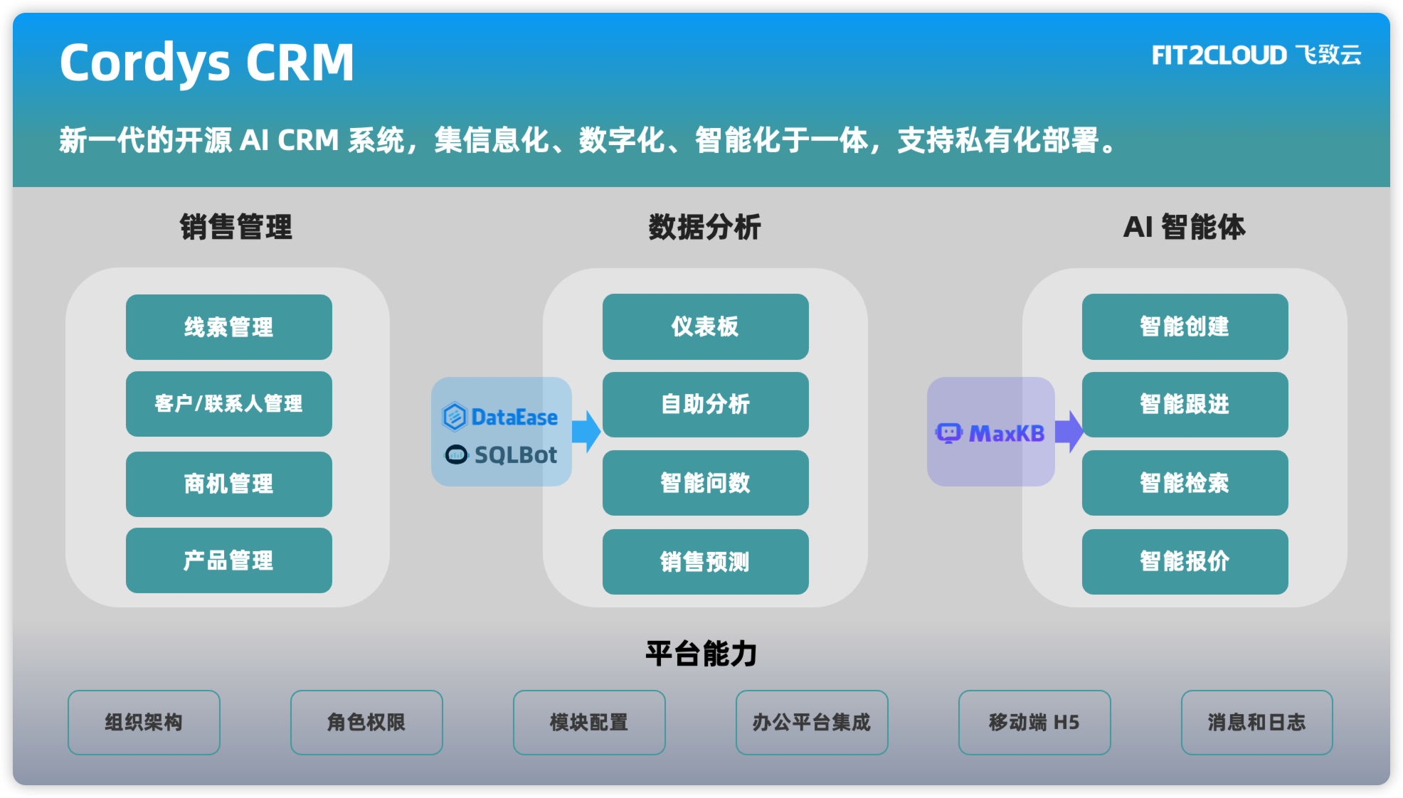 - BI 加持:融合 DataEase 与 SQLBot 的强大能力,实现销售数据可视化呈现、自助分析,以及基于自然语言的智能查询与归因分析