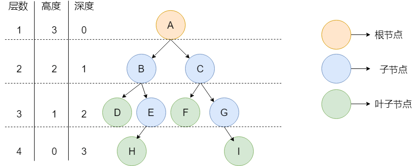 • 叶子节点:没有子节点的节点。上图中的 D、F、H、I 都是叶子节点。