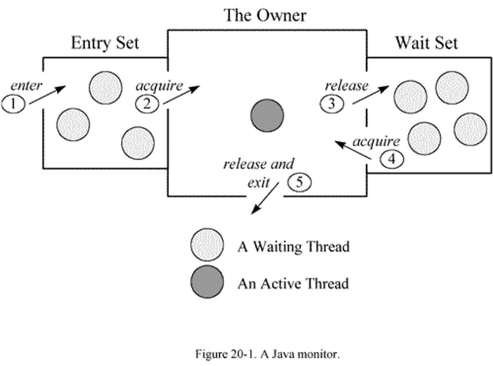 如上图,每个Monitor在某个时刻,只能被一个线程拥有,该线程就是 “ActiveThread”,而其它线程都是 “Waiting Thread”,分别在两个队列“Entry Set”和“Wait Set”里等候。在“Entry Set”中等待的线程状态是“Waiting for monitor entry”,而在“Wait Set”中等待的线程状态是“in Object.wait()”。