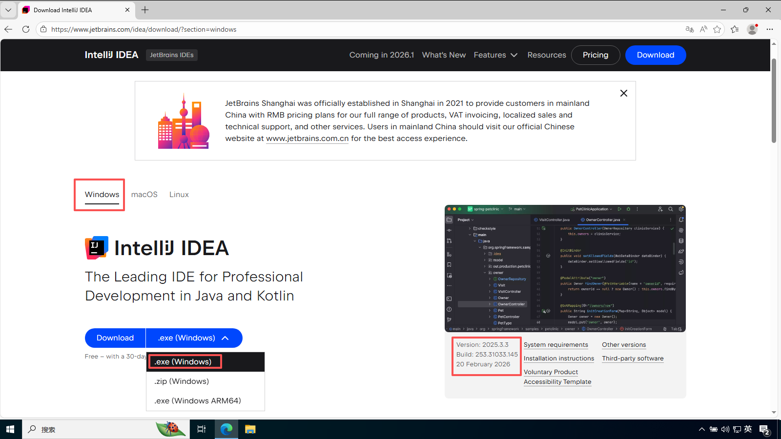 官方下载地址:https://www.jetbrains.com/idea/download/?section=windows