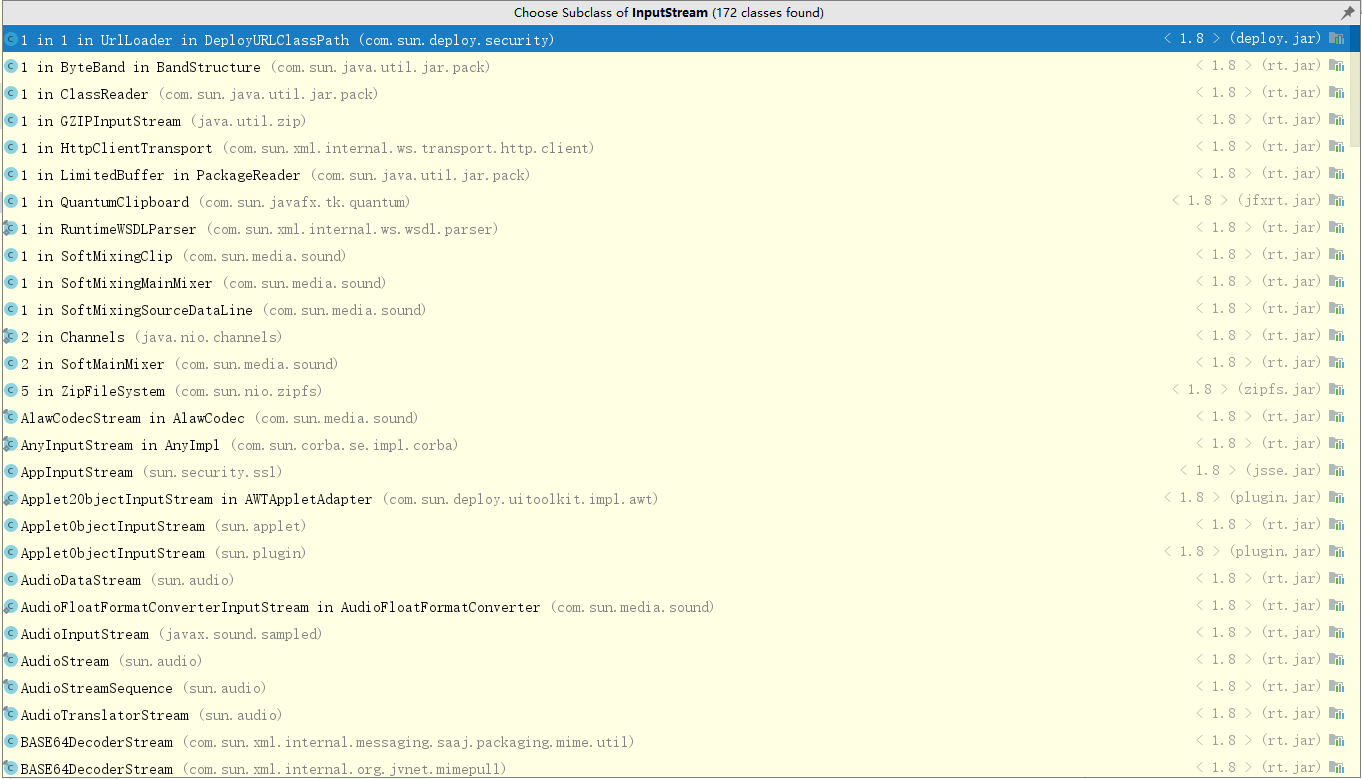 InputStream 是所有表示字节输入流类的父类。windows操作系统的JDK8版本中,所有的InputStream的子类如下(此处只展示部分):