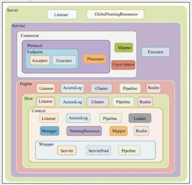 - Container(容器):负责加载和管理 Servlet,处理业务逻辑,包含四级嵌套容器: