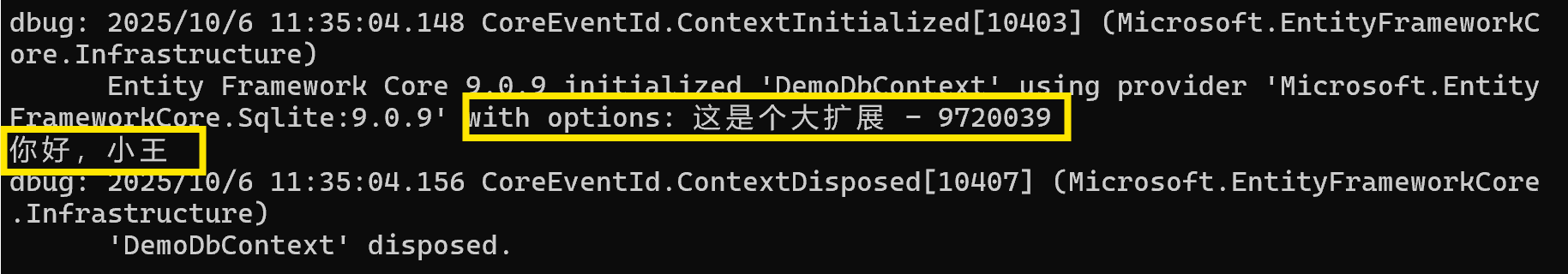 public class DemoDbContext : DbContext { …… protected override void OnConfiguring(DbContextOptionsBuilder opBuilder) { opBuilder.UseSqlite("data source=:memory:") // 开启日志 .LogTo(log => Console.WriteLine(log)) // 使用自定义的扩展 .UseDemoExt(); } // 测试服务 public void Greeting(string who) { IHelloWorld sv = this.GetService<IHelloWorld>(); sv.SayHello(who); } }