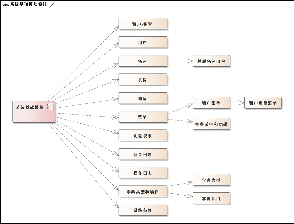 一个基础的系统,往往需要包含基础的相关模块内容,多租户系统框架下也需要这些,如用户、角色、机构、岗位、权限、菜单、日志(登录日志、操作日志)、通用字典等内容,多租户/账套还需要额外一个多租户/账套信息的管理,如下模块分类所示。