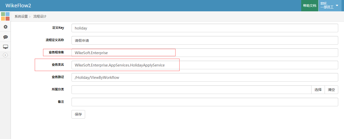 演示用例的请假申请的业务程序集是WikeSoft.Enterprise,业务类名是WikeSoft.Enterprise.AppServices.HolidayApplyService
