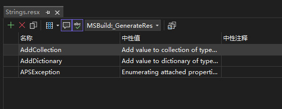 完成安装之后,就可以尝试多语言的加入了。只需放入 resx 文件,无论命名和放在哪个文件夹内。为了简单起见,我随便从 WPF 仓库拷贝了一个 Strings.resx 文件,编辑之后的内容如下