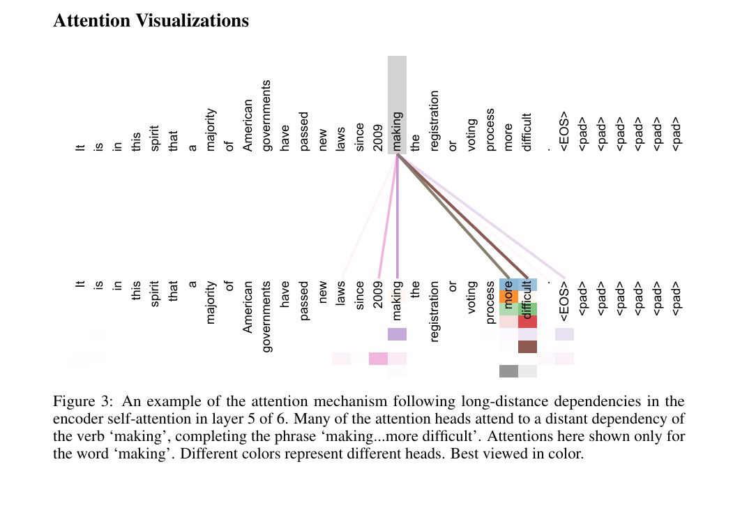 “图 3:6 层编码器自注意力中第 5 层的注意力机制捕捉长距离依赖的示例。许多注意力头会关注动词 “making” 的远距离依赖,以补全短语 “making…more difficult”。此处仅展示针对单词 “making” 的注意力情况。不同颜色代表不同的注意力头。建议以彩色查看。”
