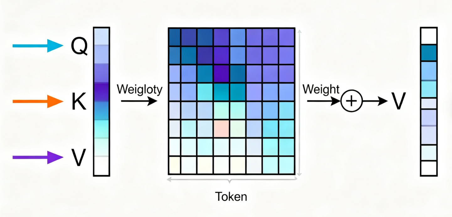 通俗类比:把处理句子比作“班级自我介绍”——以前的RNN是“按座位顺序逐个发言,只能记住前一个人的名字”;自注意力是“所有人同时站起来,每个人手里举着自己的‘关键词牌’(K)和‘详细介绍’(V),你(当前token)拿着自己的‘需求牌’(Q),快速和所有人比对:和你需求越匹配的人,你越认真听他的介绍,最后把所有人的介绍按‘认真程度’加权整合,形成自己的最终印象”。