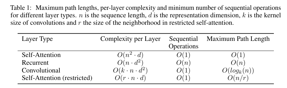 “表 1:不同层类型的最大路径长度、每层复杂度及最小顺序操作数注:n 为序列长度,d 为表示维度,k 为卷积核大小,r 为受限自注意力中的邻域大小”