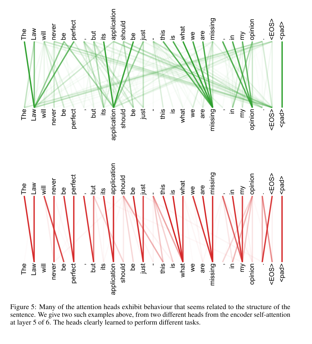 “许多注意力头表现出与句子结构相关的行为。我们在上面给出了两个这样的例子,它们来自 6 层编码器自注意力机制中第 5 层的两个不同注意力头。这些注意力头显然学会了执行不同的任务。”