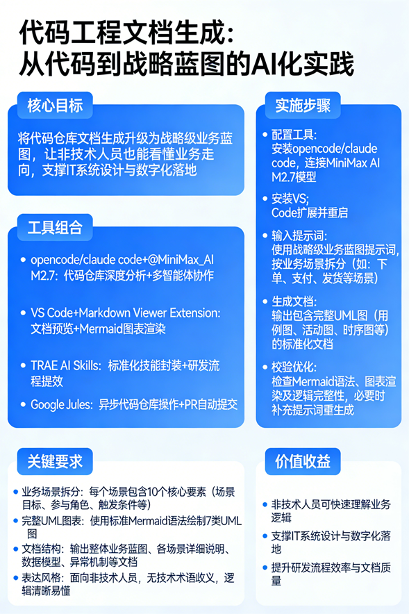 将代码仓库文档生成升级为战略级业务蓝图,核心是用标准化业务场景拆分 + 全量 UML 图表 + 结构化文档,让不懂技术的产品 / 管理者也能一眼看懂业务走向,同时支撑 IT 系统设计与数字化落地。阅读程序代码仓库的工作可全部交由AI完成,预先让AI生成详细的文档及图表,实际应用效果良好。