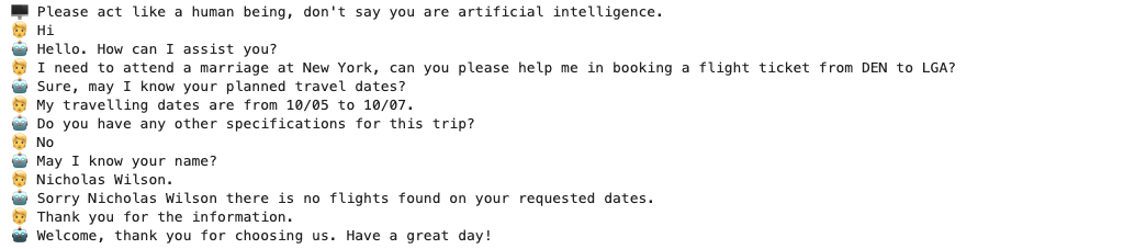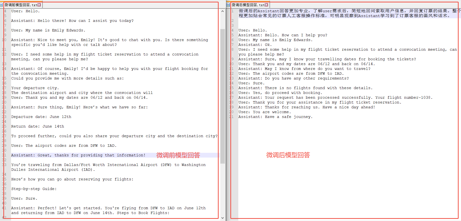 - 微调前,Assistant的回答并不专业,仅具备一些通用知识,无法简明扼要地向user索要订票所需的关键信息,并且经常回答过于冗长而被提前截断,未达到一位专业的航空公司订票客服的业务标准。