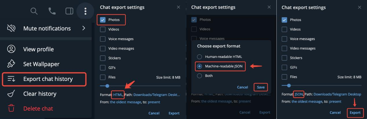 在Telegram应用中,单击需要导出聊天记录的聊天对象,单击对话框右上角的省略号按钮,在弹出的选项中选择“Export chat history”,选择照片类型,格式选择JSON,可以导出多个联系人(不建议使用群聊记录)。然后将导出的ChatExport_*文件夹放在./dataset/telegram目录即可(不同人聊天记录的文件夹一起放在 ./dataset/telegram)。