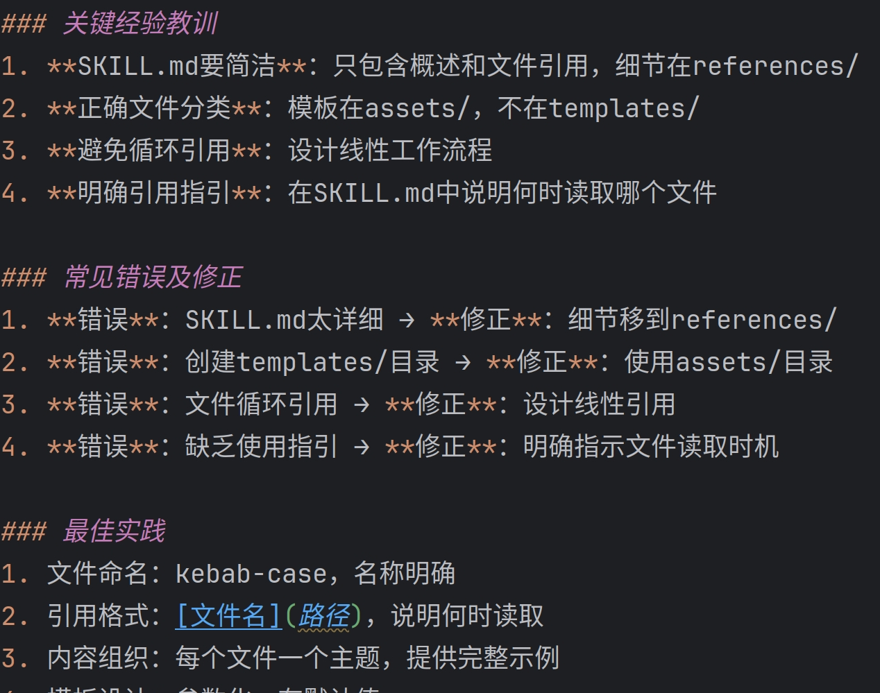 - 重要的事情说三遍:每一次大的优化和调整指令后,都反复强调要followskill-creator的说明
