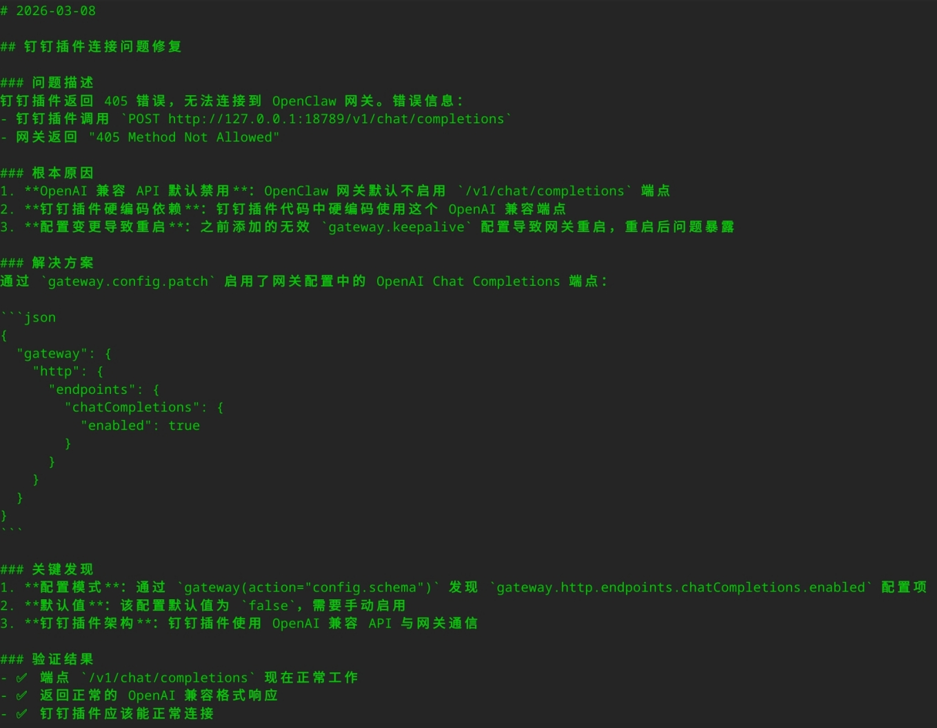 触发后,OpenClaw会启动独立Agent,对最近15条对话进行摘要总结。下面是我配置龙虾第一天、接入钉钉插件后,在重启对话时模型保存的当日memory:
