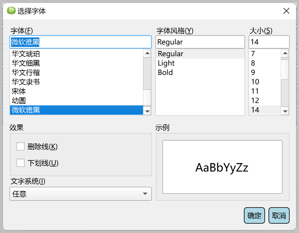 font = QApplication.font() # 获取系统默认字体 # 打开字体选择对话框 ok, selected_font = QFontDialog.getFont(font, parent) # 返回选择的字体和是否成功 return selected_font, ok