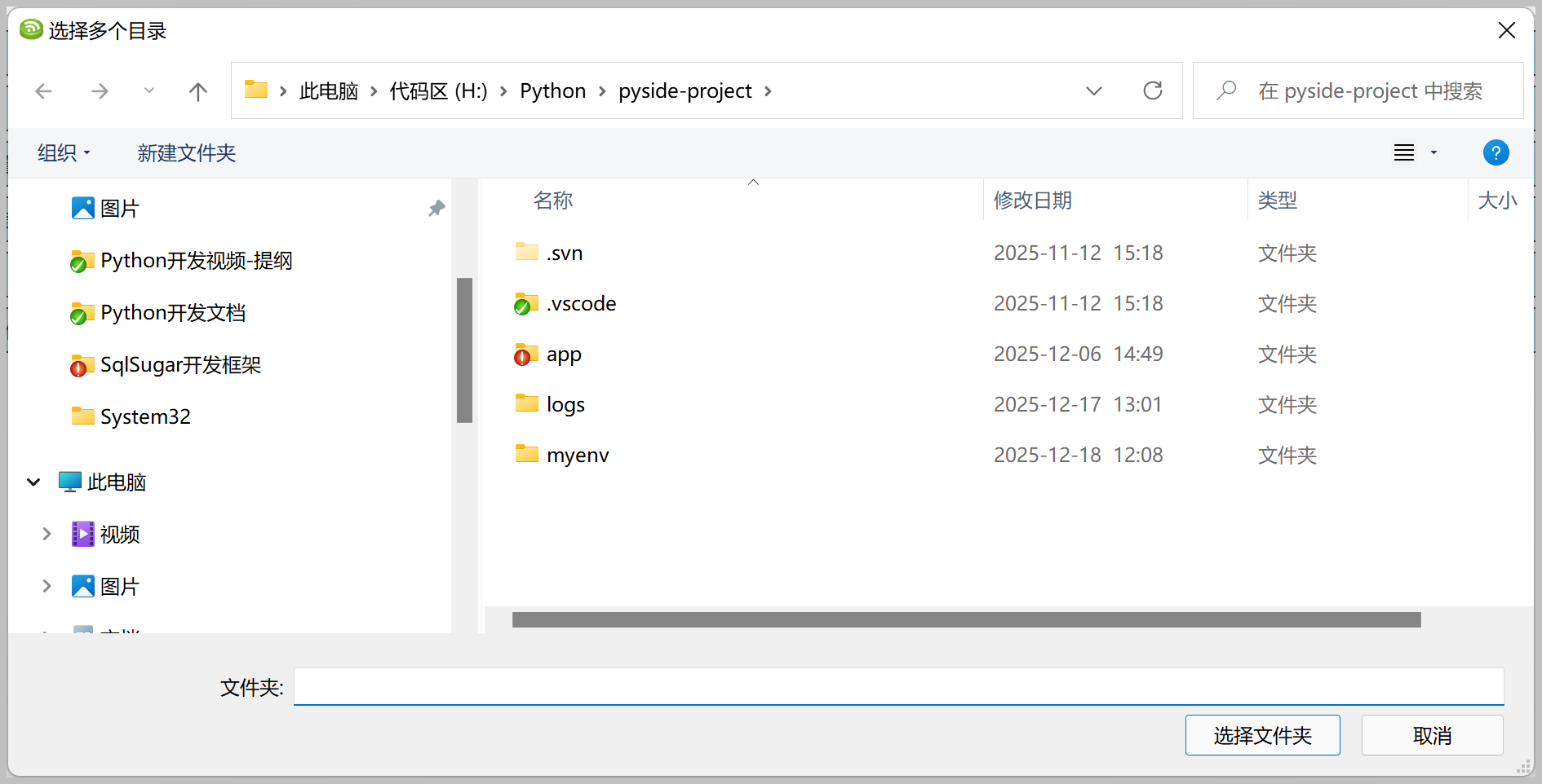 dialog.setFileMode(QFileDialog.FileMode.Directory) # 设置为目录选择模式 dialog.setOption(QFileDialog.Option.ShowDirsOnly, True) # 只显示目录  dialog.setDirectory(initial_directory) # 执行对话框并获取选中的目录 result = "" if dialog.exec():