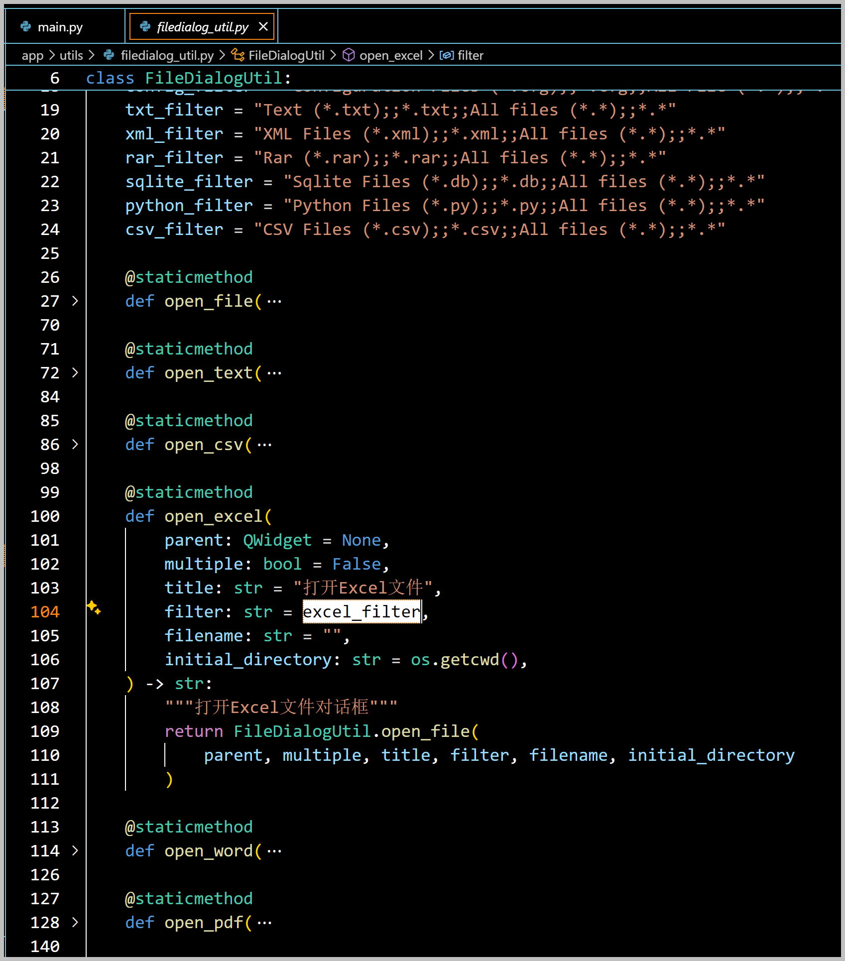 当然上面 open_file 传入的是所有文件的格式,如果我们需要跟进一步选择Excel格式,就需要传入对应的后缀名参数常量即可。如下所示。