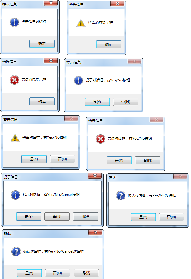 封装的消息提示对话框包括个各种常用的对话框,如下所示: