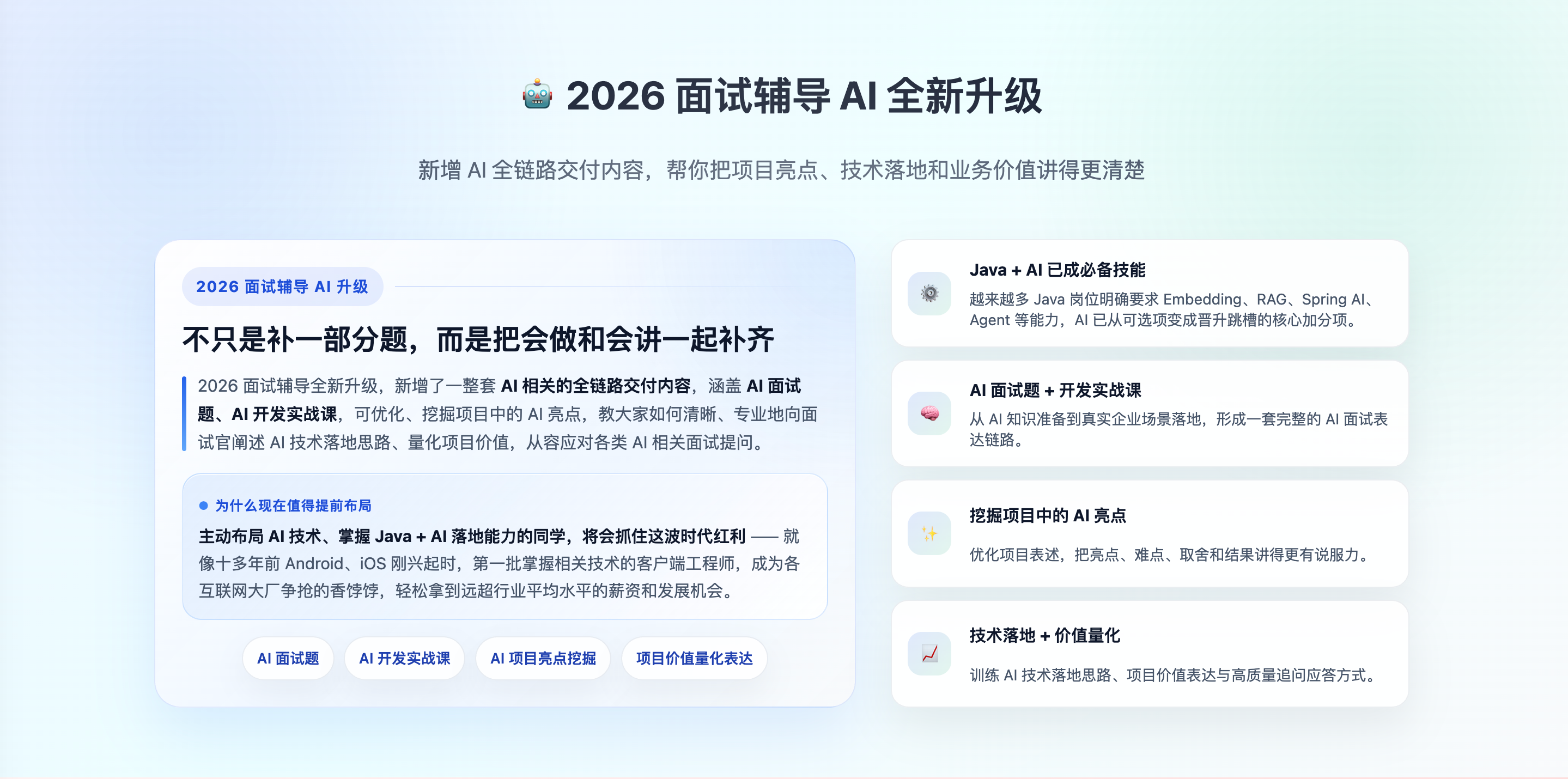 如果你也想在 AI 赋能的时代,抓住跳槽涨薪的黄金机会,欢迎加入我们的面试辅导,我们会帮你系统、全面地掌握 Java + AI 的核心技能,助你在面试中脱颖而出。