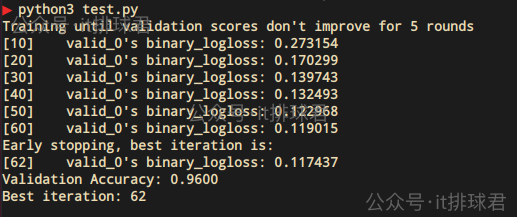 objective:binary表示分类任务的损失函数metric:binary_logloss表示监控指标为对数损失函数,也可以换成binary_error表示误差率num_boost_round=1000:最大迭代次数stopping_rounds=5:连续5轮不提升则停止period=10:每10轮打印日志