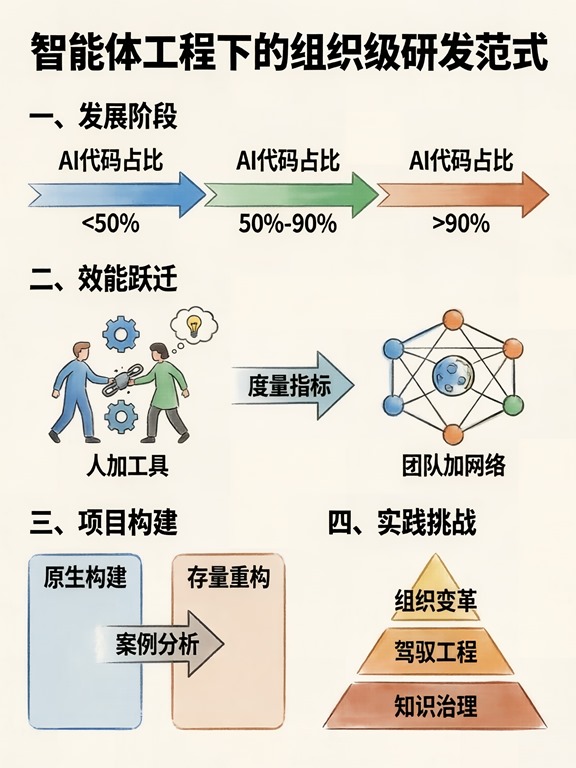 - 发展阶段:AI编码实践分为三个阶段:从人主导、AI辅助的行/函数级生成(AI代码<50%),发展到AI独立完成任务的智能体模式(AI代码50%-90%),最终迈向多智能体并行的自主工作模式。