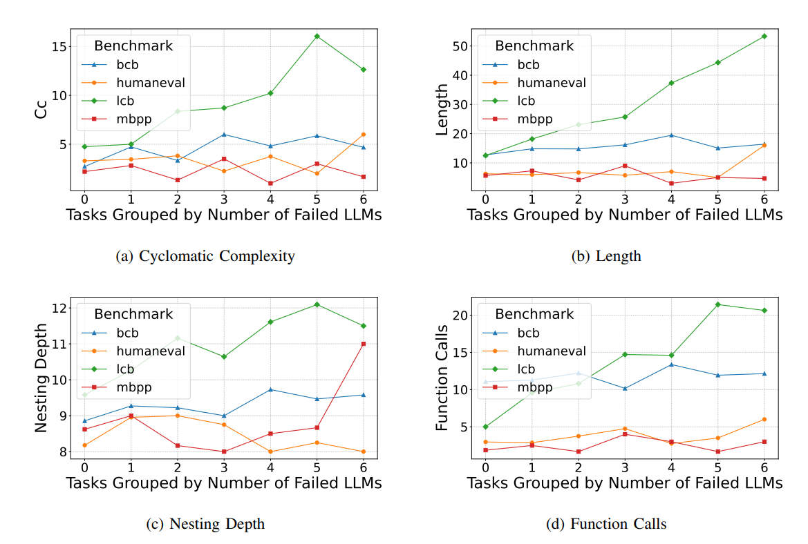 我们通常认为,代码越复杂,AI越容易出错。但这项研究的第一个发现就给这个普遍认知泼了一盆冷水。研究中的一个核心发现颠覆了我们的直觉:在HumanEval、MBPP和BCB-Hard这三个广受欢迎的基准测试中,解决方案代码的复杂性(如圈复杂度、代码长度、嵌套深度)与模型的失败率之间并没有表现出明显的正相关关系。