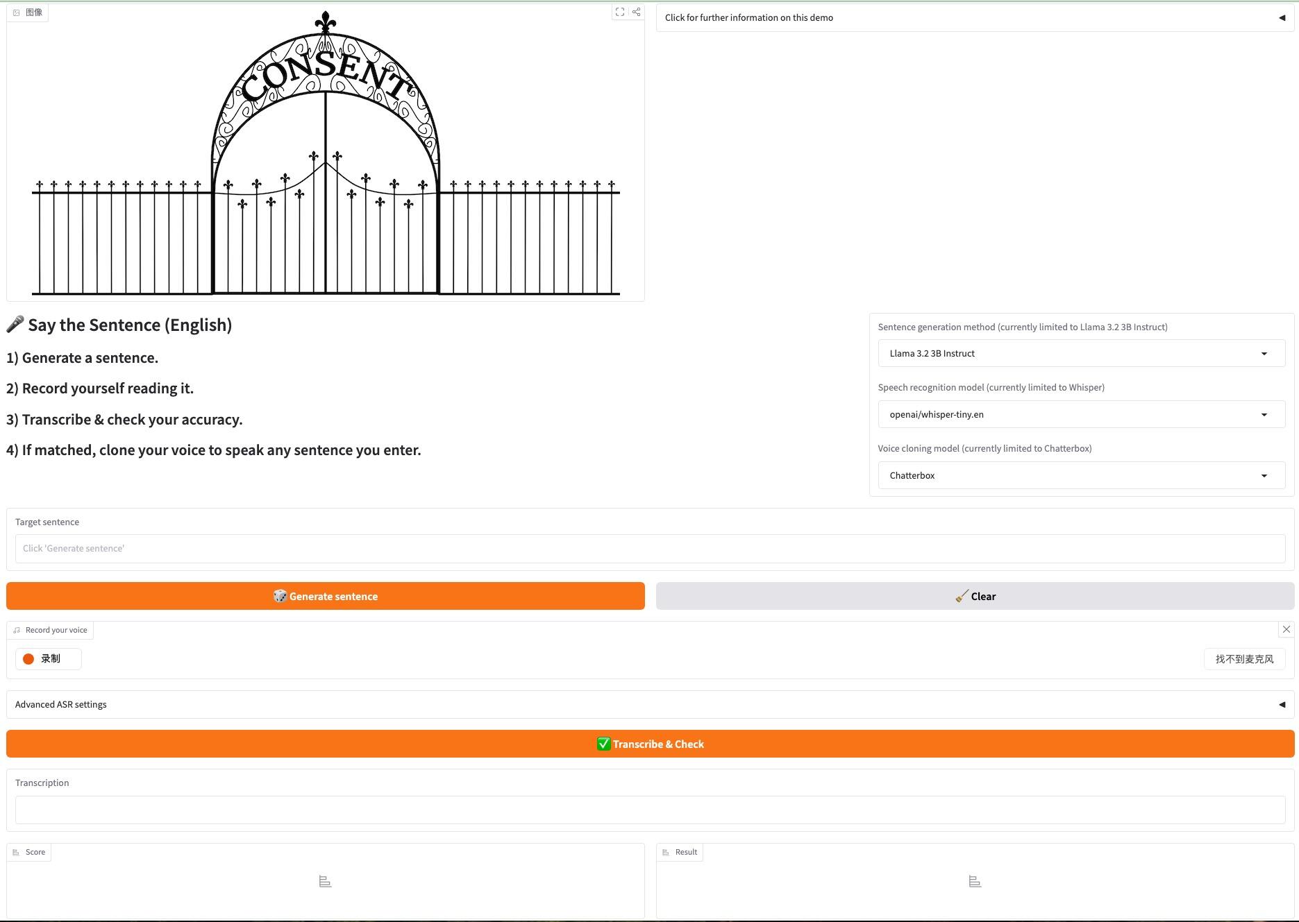 在英语语音克隆系统中创建语音同意门的方式是:为说话人生成一句简短、自然、约20个单词左右的英文语句,让其朗读。这句话要明确表达对当前使用情境的知情同意。我们建议在句中明确包含“同意语句”和“模型名称”,比如:“I give my consent to use the voice cloning model with my voice(我同意使用 <模型名称> 语音克隆模型克隆我的声音)”。同时建议使用 麦克风实时录音,而不是上传音频文件,以防止使用之前录音剪辑过的语音。使用全新(从未说过的)句子也能进一步确保这个“同意”是针对当前情境、主动做出的、知情且明确的同意。