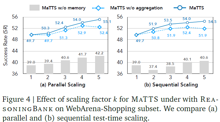 论文在Webarena上实验了,两种test-time-scaling策略,并发现二者都进一步提升原有memory的使用效果,并切均有较好的扩展效应,其中Parallel策略的效果增益衰减的更慢,扩展效应更好。可能得益于更多并行策略带来的更丰富的空间探索和多样性。