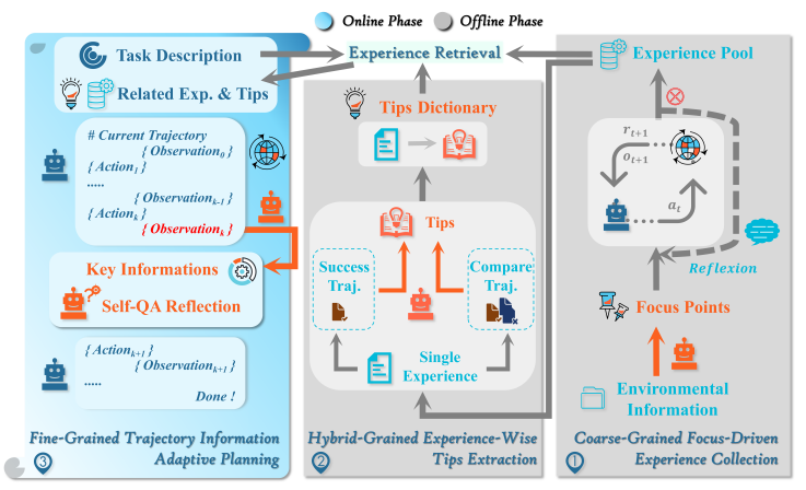 前两步离线完成,第三步是在线执行中的经验应用。任务开始时,基于任务描述通过向量检索寻找相似历史任务,将其成功轨迹和混合粒度提示作为上文。执行中遇到失败时,采用两步反思机制: