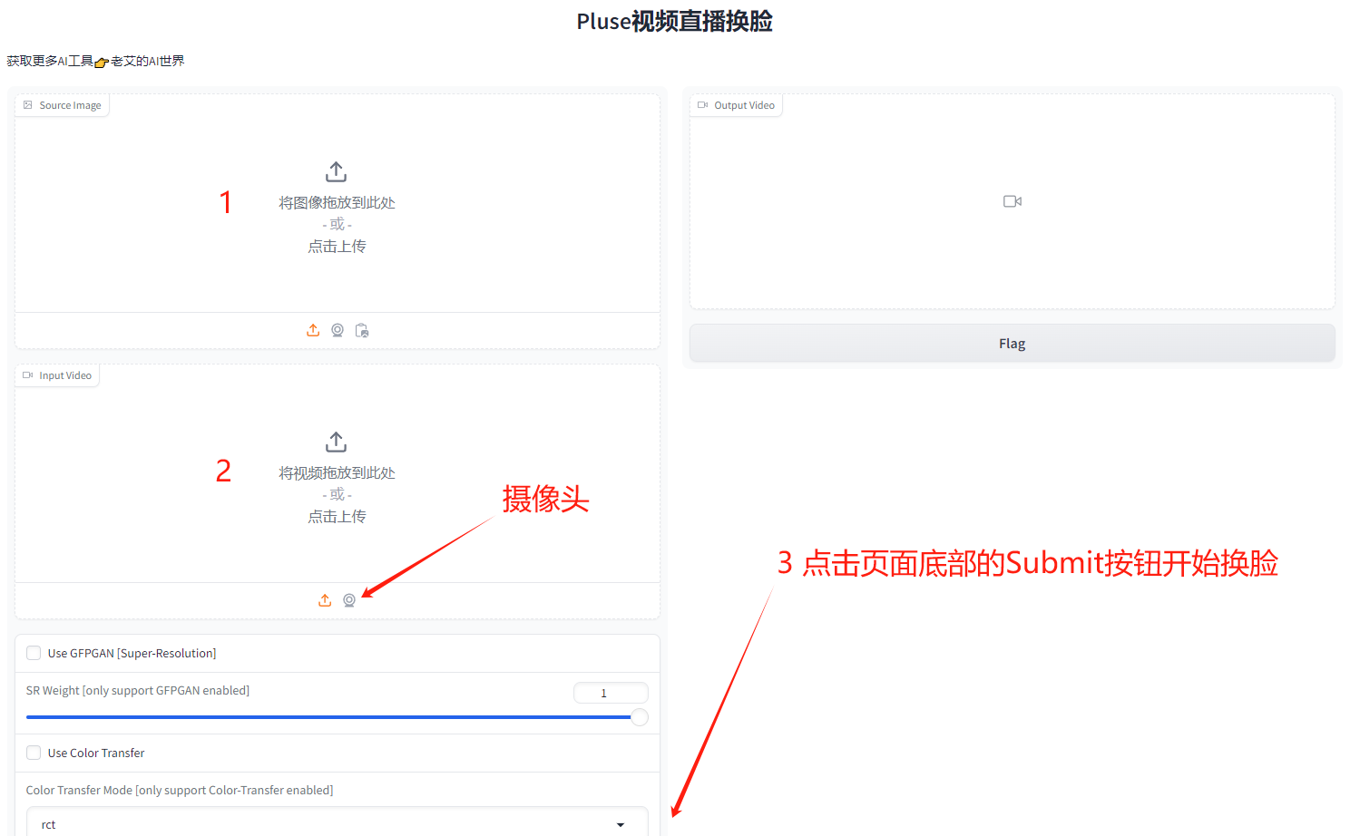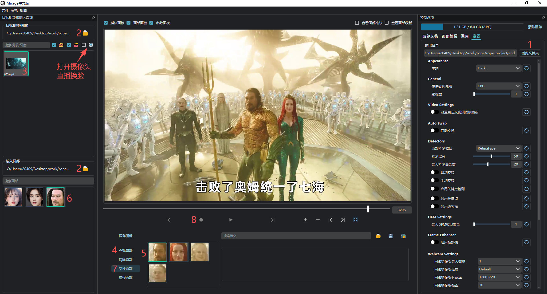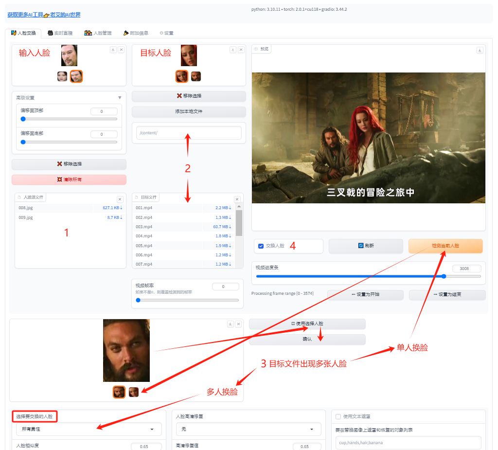Rope的使用步骤已标记到下方图例中,操作非常简单,Rope还自带剪辑功能,可以从任意时间点换脸,即使中途停止也会保存处理后的视频