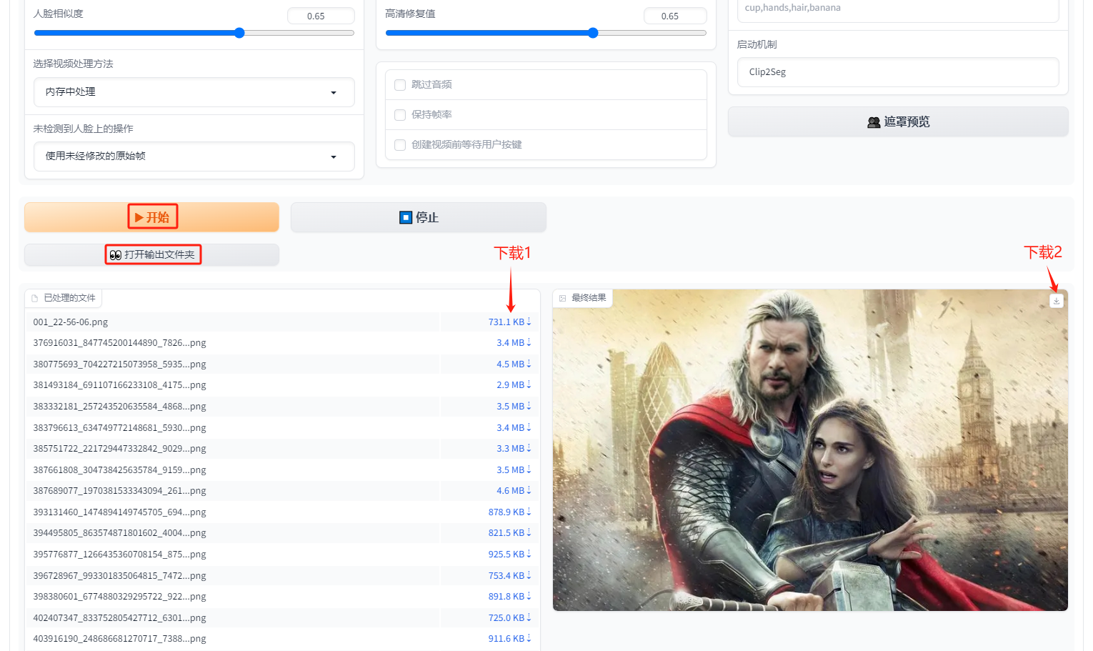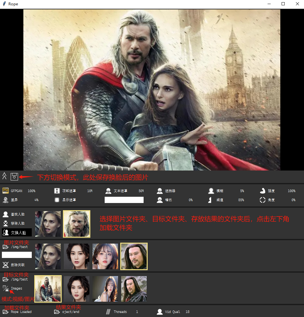 Rope可以自由调节嘴巴相似度、模糊度和人脸角度,“阈值”是多人换脸,“强度”改变交换中的人脸匹配度,底部的Threads是线程数,拉大可以提升处理速度,Vid Qual是视频质量