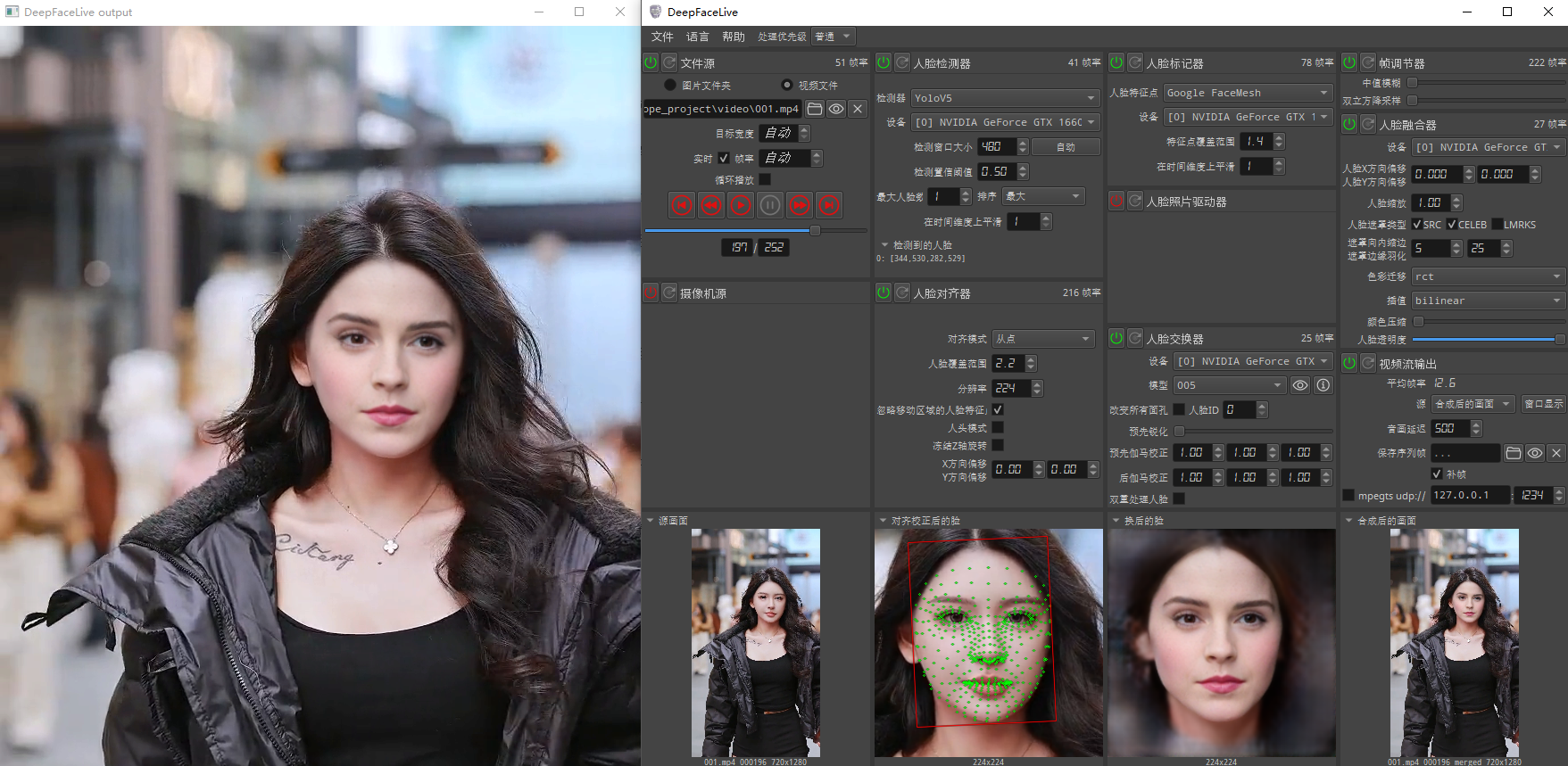 dfm模型文件在人脸交换器中选择,把视频流输出中的“源”设置为“合成后的画面”,点击右侧的窗口显示,就可以看到实时的换脸效果