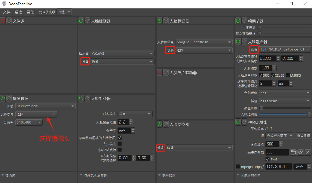 DeepFaceLive在直播的时候,需要先启动摄像机源,然后依次打开人脸检测器、人脸对齐器、人脸标记器、人脸交换器、帧调节器、人脸融合器和视频流输出,把“设备”选为最高配置的N卡,其余参数一般不用改动