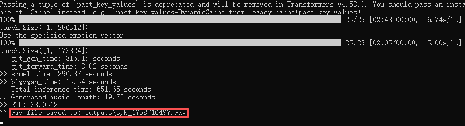 可以在软件后台查看当前的执行进度,程序处理完毕会输出信息wav file saved to,生成的音频默认保存在项目路径的outputs文件夹下,也可以在“输出界面”的右上角点击下载