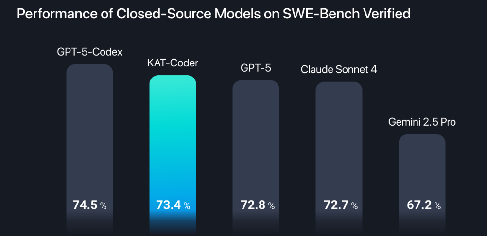 - 极致性能:在 SWE-Bench Verified 基准测试中,KAT-Coder 以 73.4% 的解决率 稳居全球第一梯队,性能比肩顶尖闭源模型(如 GPT-5、Claude 4),显著超越开源模型。