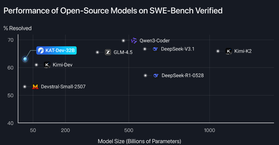 KAT-Dev-32B(开源版)以 32B 参数规模在 SWE-Bench Verified 中取得 62.4% 的解决率,位列开源模型前五,但性能仍低于闭源的 KAT-Coder。