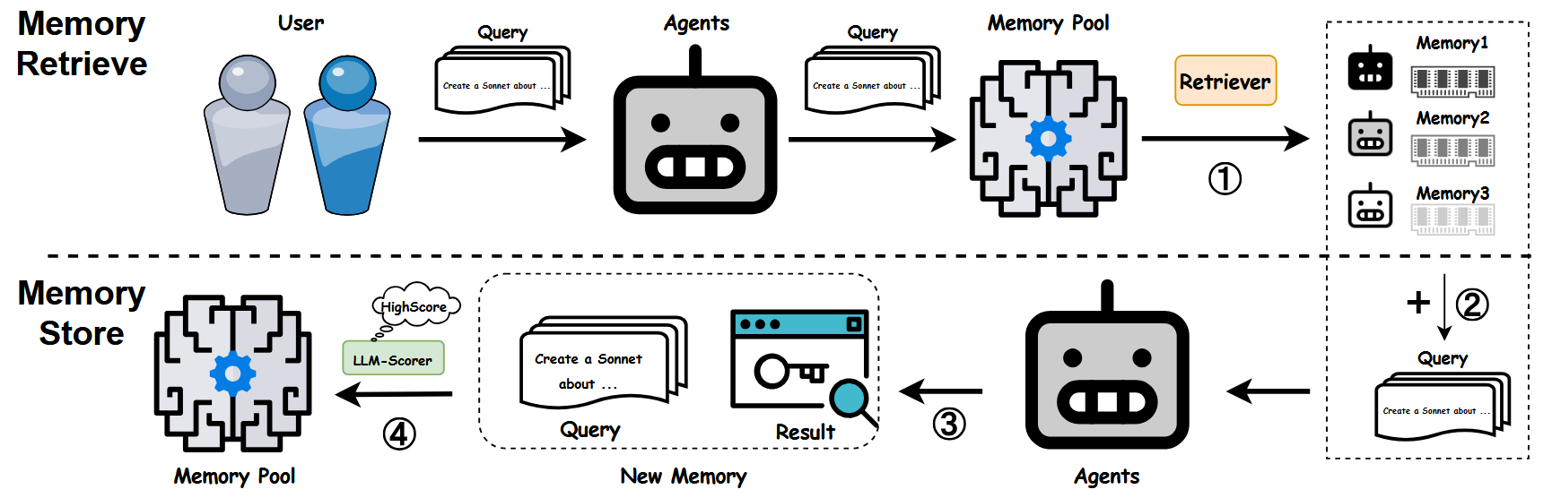 记忆本质上是 Prompt-Answer 对(PA pair),每次交互后,对于每个新生成的记忆,LLM 评分器会给它进行评分并决定是否将其加入共享记忆池