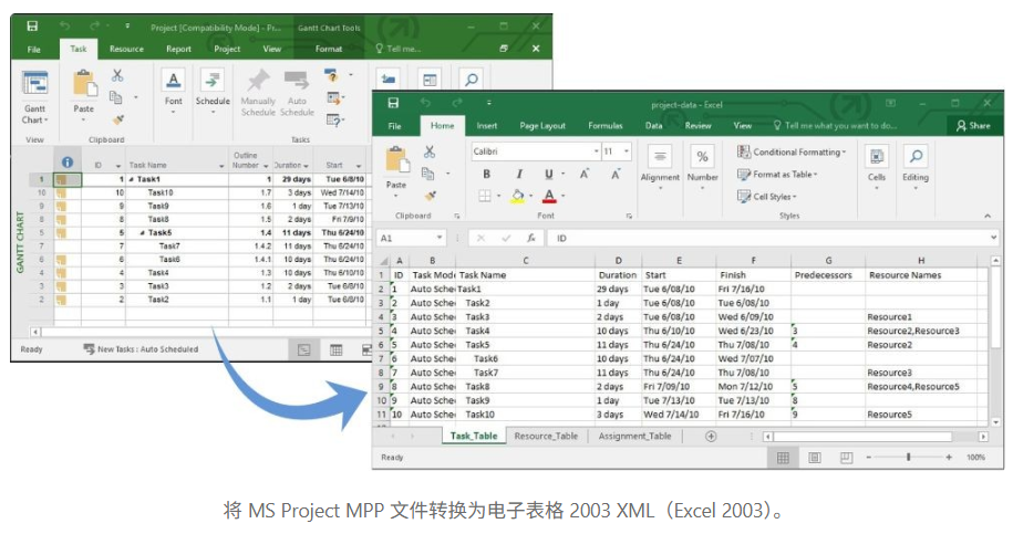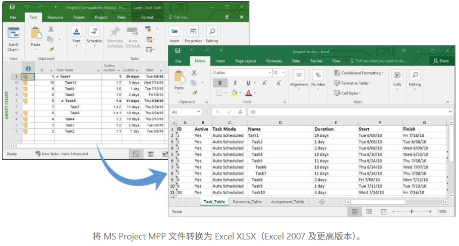2. 将 MS Project MPP 文件转换为 Excel XLSX 文件(Excel 2007 及更高版本)