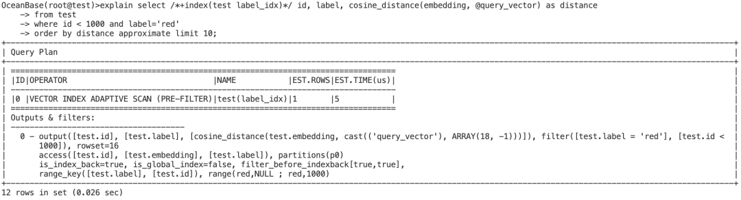 使用标量过滤条件的方法是在向量索引查询中直接带上标量过滤条件。OceanBase 为标量和向量的混合检索实现了多种查询算法,例如前过滤和迭代式过滤算法,可以保证尽可能高的性能和召回率。在 HNSW / HNSWSQ / HNSWBQ 索引上,还实现了执行期算法的自适应选择(IVF / IVFPQ 的自适应将在下个版本提供),这是为了应对代价估计和实际数据的差异,在查询执行时,OceanBase 也会通过执行中的统计信息来修正后续的执行流程。