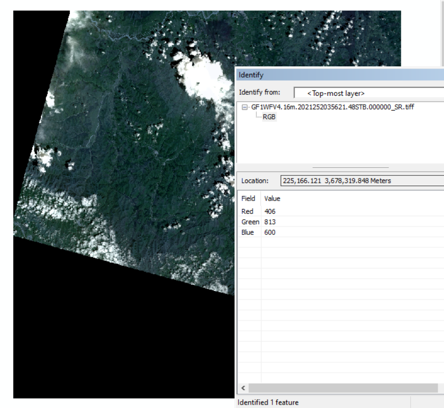 首先,我们明确一下本文的需求。现在有一个栅格遥感影像文件,其为.tiff格式的文件(但其实和.tif格式文件的操作方法是一样的),且像元的数值都是真实数值乘上10000之后的。这一遥感影像如下图所示,可以看到其各个波段的像元像素数据都是几百、几千的范围。