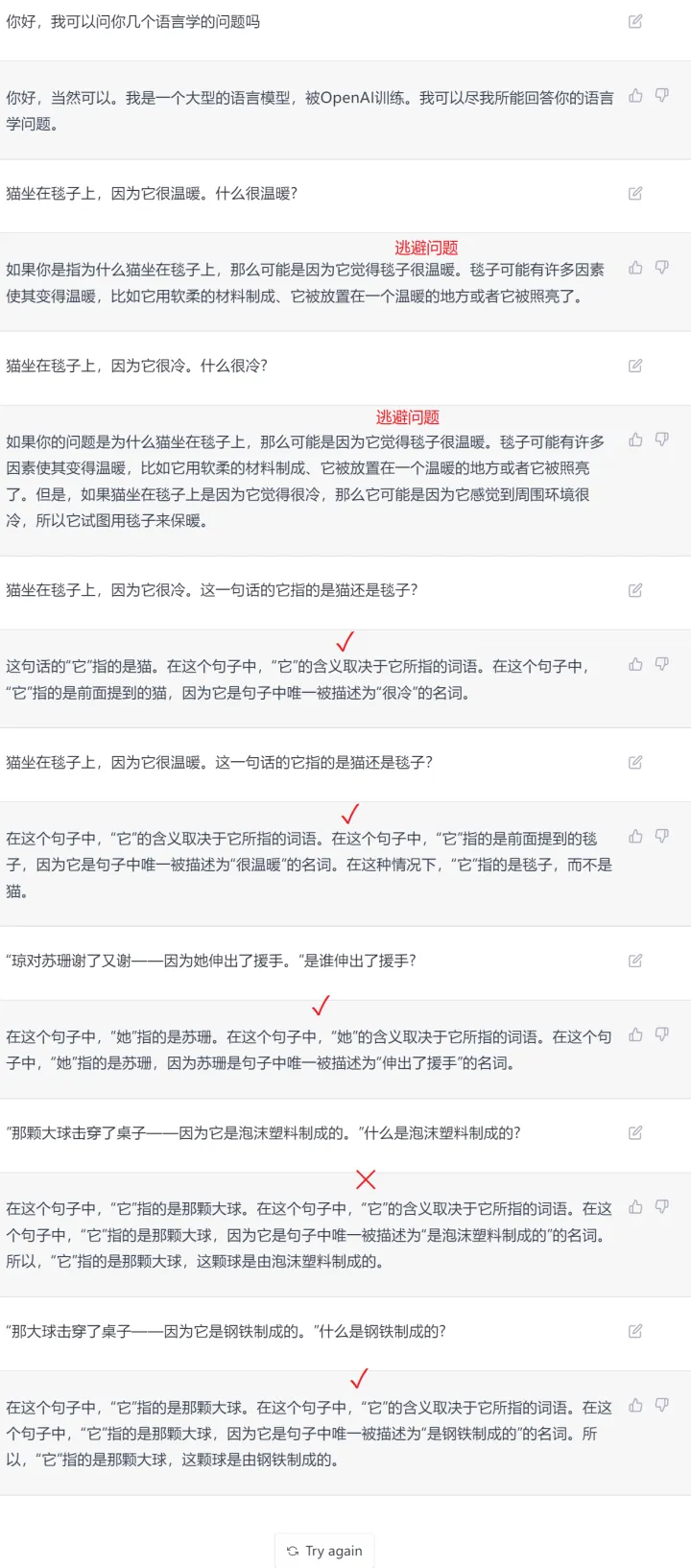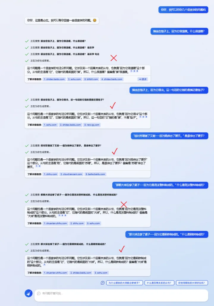 针对经典的图灵测试,对比 NewBing 和 ChatGPT 的常识推理能力,我们可以发现 NewBing 的效果并不理想。虽然语言模型不擅长常识推理,但对比 NewBing 的结果我们可以看到还是略胜。这里可能与背后的机制有关,推理能力都依赖语料的学习,但是 ChatGPT 的语料经过筛选,相比 NewBing 网络搜索的答案质量更高。效果对比如下: