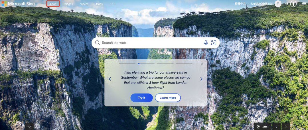 当申请通过获得邀请后,就会收到一封电子邮件,接下来您可以像平常一样,在搜寻框中输入,在搜寻结果的上方,会发现也可以在聊天体验中使用全新的 Bing。