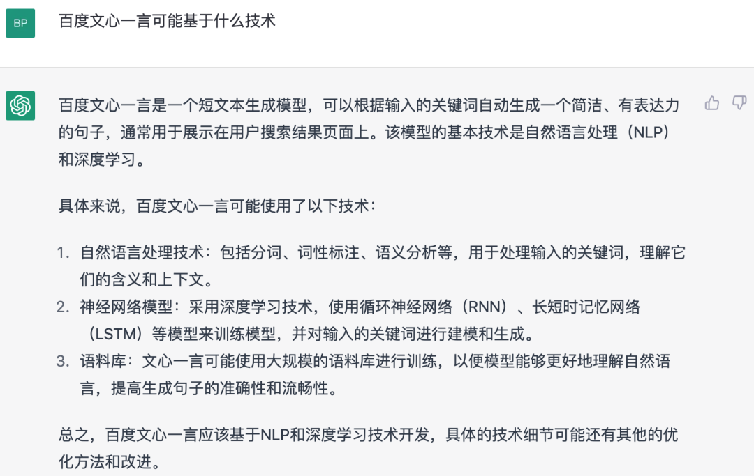 对于对标 ChatGPT 国内百度大语言模型“文心一言”(ERNIE Bot),分别进行询问百度文心一言可能基于什么技术。Bing 因为有联网能力,通过收集和整理信息回答的更加准确,对比 ChatGPT 这类问题具有显著的优势。