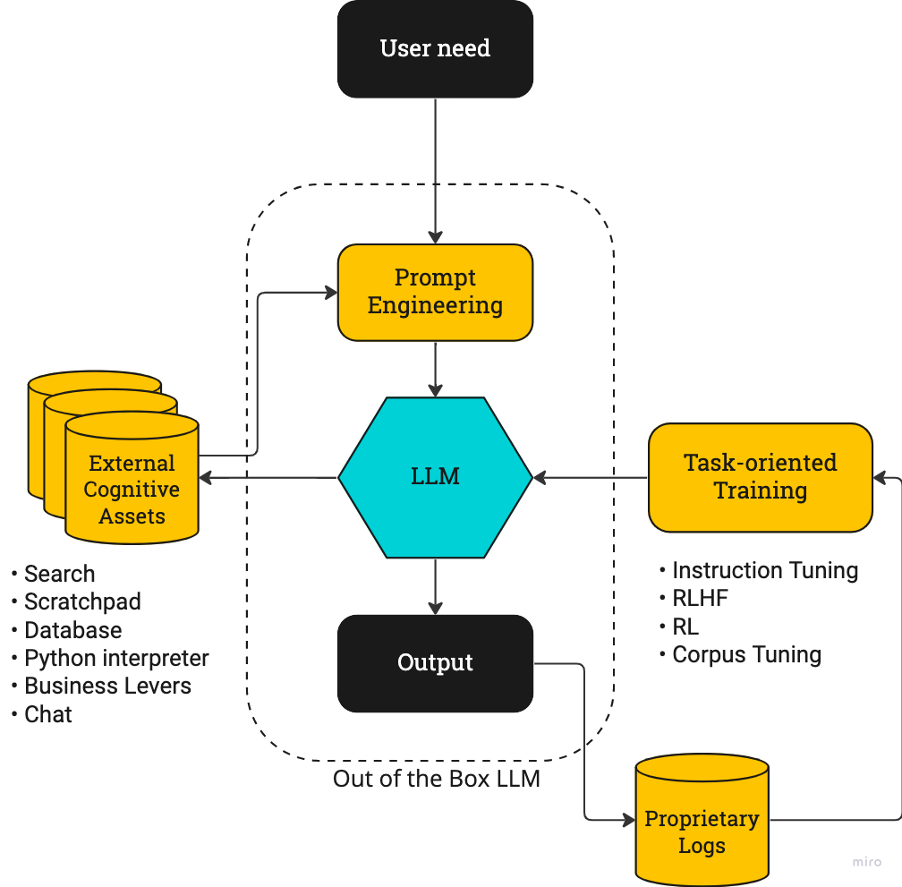 右边是任务导向的训练,如 instruction tuning、RLHF 等,也就将 ChatGPT 技术引入进来的过程。整体上 RL 利用使用日志等专有数据,通过创建强大的反馈回路,训练模型使其更加符合任务需求并迭代优化。