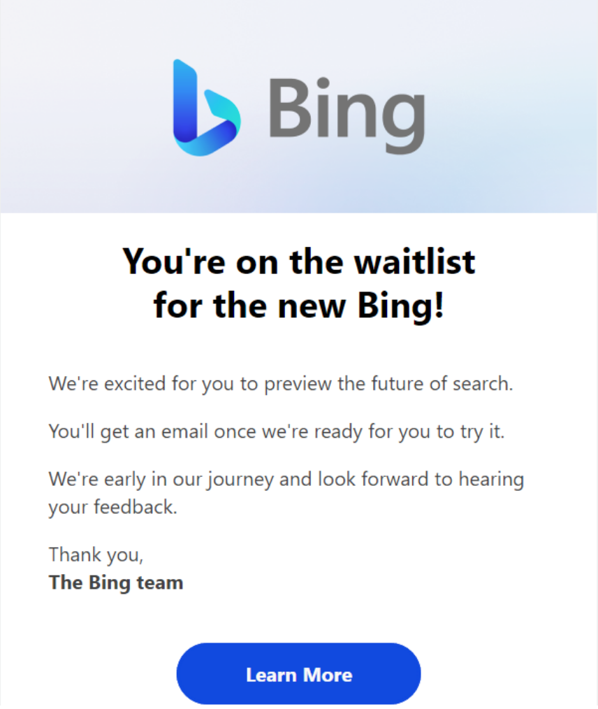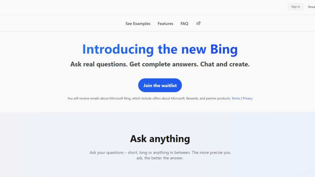 通过点击网页(https://www.bing.com/new)的 “Join the waitlist” 来请求使用新版本基于 AI 的 Bing 搜索引擎,进入审核等待队列。