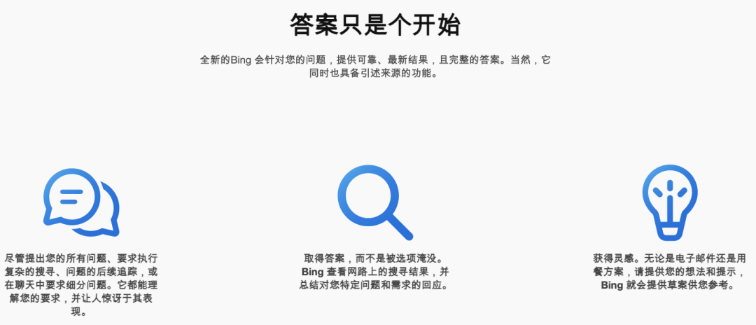 全新的 Bing 就像有研究助理、个人规划师及创意合作伙伴陪着您上网搜寻一样,特色能力总结如下: